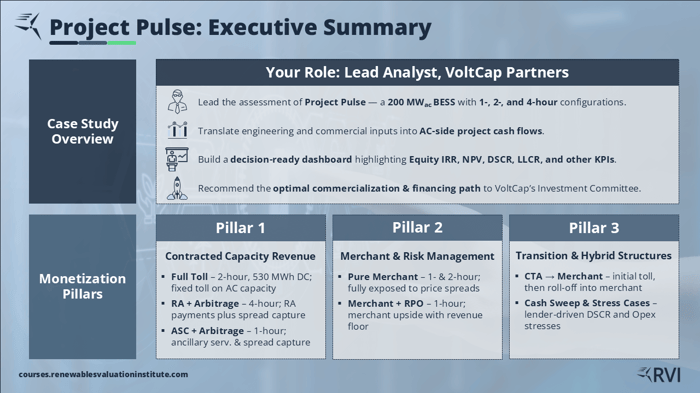 The BESS Deal Lab (Project Pulse) is a hands-on case study where you build and analyze a 200 MW multi-duration BESS project finance model the way an investment team would: starting from technical and commercial inputs, translating them into lender-clean AC-side cashflows, and ending with a decision-ready dashboard that supports an investment committee recommendation.