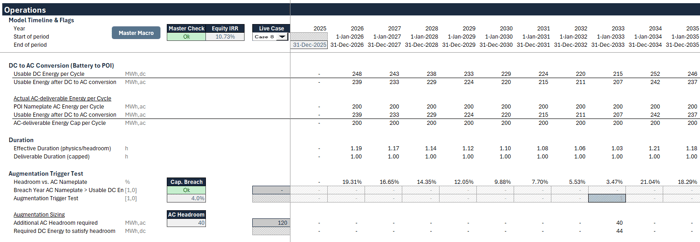 A lender-clean model, therefore, keeps strict boundary discipline: it models degradation where it belongs (DC), then translates DC energy into AC deliverability using the efficiency/loss chain. That AC deliverability is what should drive effective duration, nameplate comparisons, and ultimately augmentation timing and sizing.