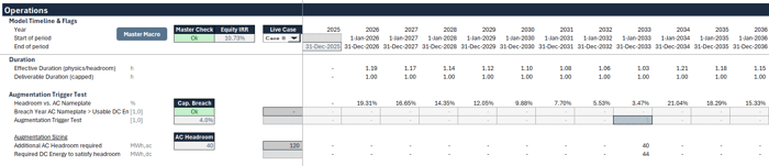 New cells degrade too, so the model should apply an augmentation-specific degradation curve that starts in year 1 of the augmentation, not year 1 of the project. That’s why many lender-clean models use an augmentation year counter. If the operating strategy is cycling-intensive (often the case in merchant-heavy scenarios), the first augmentation may not be enough, and the model may correctly trigger a second campaign later in the asset life.