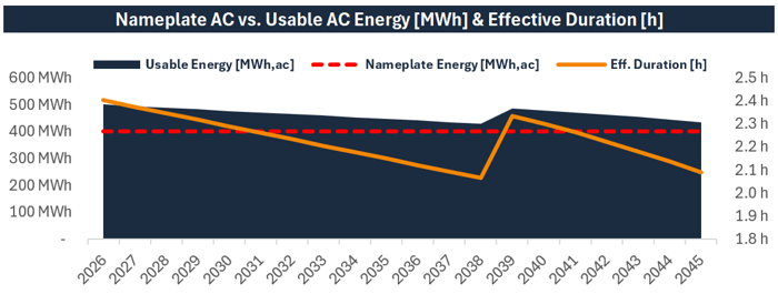 Early in life, effective duration is often above nameplate because systems are designed with buffer (including DC overbuild and conservative operating limits). But as degradation accumulates, effective duration declines. When it approaches—or falls below—nameplate duration, the battery is at risk of no longer delivering the contracted product. That’s why effective duration is one of the most practical “watchdog” KPIs in bankability-focused BESS modeling and the natural input into augmentation trigger logic.